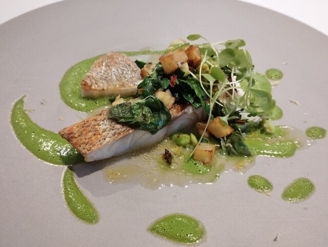 イシナギというお魚にクレソンのソースやフュメ・ド・ポワソン
