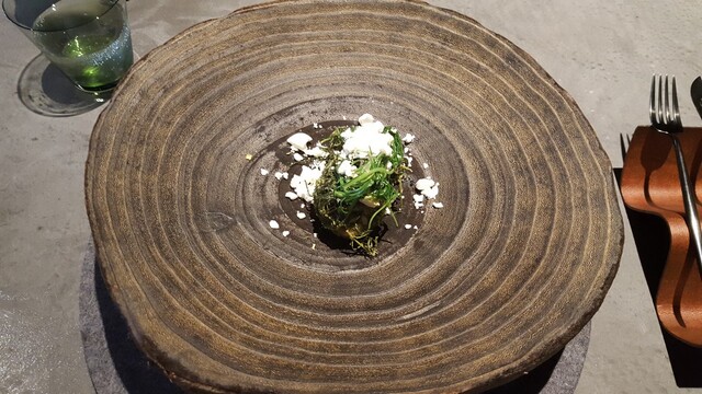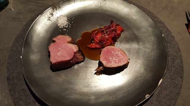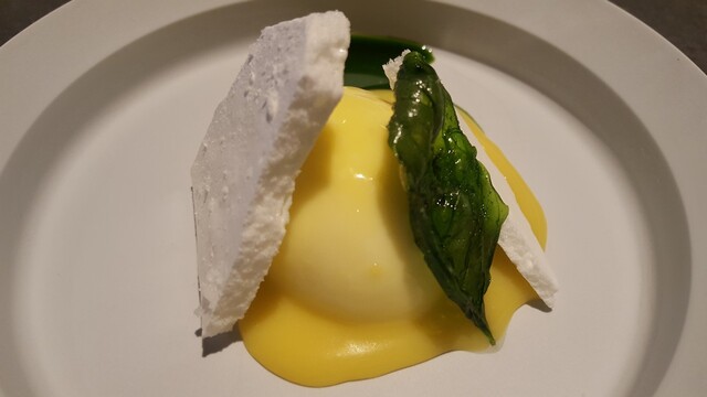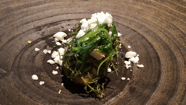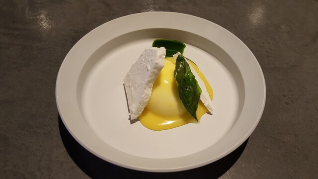 白い板状のものは、メレンゲを液体窒素で固めたもののようで、サクサクな食感が新鮮!甘酸っぱい味付けのモッツァレラが美味しいです。