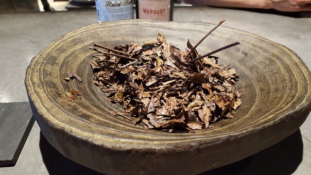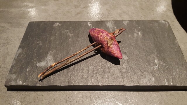 枯れ葉の中で燻されたさつま芋はホクホクで甘みたっぷりの仕上がりです。否が応でも、この後のコース料理に期待が高まります!