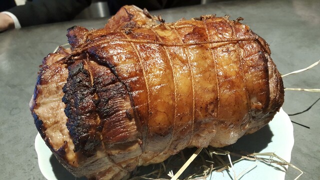 塊の状態でしっかり焼色をつけた牛肉を、その日の来店客でシェアします。切り分ける前に、各テーブルを回って塊を見せてくれます。