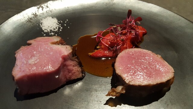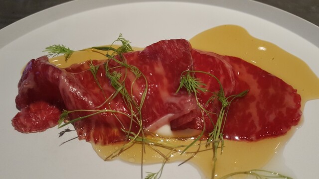 脂がたっぷりのった牛肉です。柔らかすぎて舌の上でとろけるようです。添えられた赤い塩で頂くと、一層甘みが増して美味しくなります。