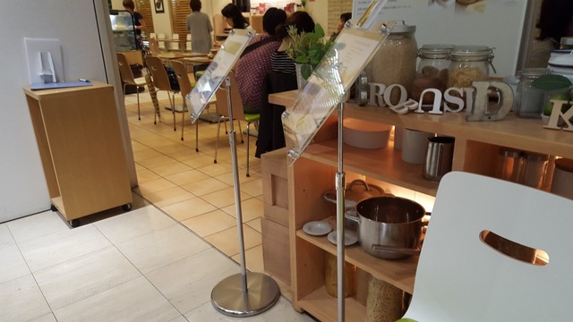 お店に入るとまず席を確保してから、レジで注文します。注文が終われば、サラダビュッフェを頼んでいればそちらへ、頼んでいなければ料理が提供されるのを待つことになります。お冷やセットのお茶はセルフサービスです。