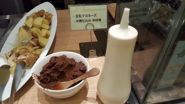 サラダビュッフェは、常時8種類のサラダが用意されています。レタス、紫キャベツ、蒸したじゃがいも、きゅうり・大根・人参のスティック、コールスロー、かぼちゃの煮物など、どれもオーガニックで新鮮なものばかりです。スティック野菜用で、豆乳マヨネーズや木樽仕込み米味噌まで用意されています。