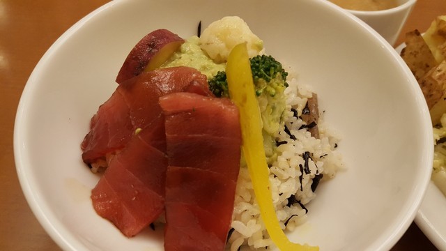 色々メニューがあって悩みましたが、ご飯と野菜をしっかり食べたいと思い、「まぐろとアボカドと秋野菜のちらし風ごはん」お野菜ビュッフェ付(1300円)を注文しました。セット内容は、丼と味噌汁、サラダビュッフェです。セットにするとルイボスティーが無料になります。