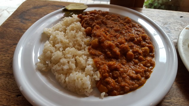そしていよいよカレーです。豆を使ったベジタリアンカレーとのことで、あっさり目のものをイメージしていたのですが、実際に食べてみると印象がガラリと変わりました。