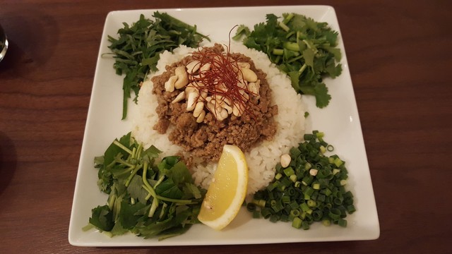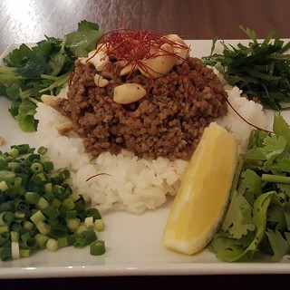 この店のそぼろカレーは、パクチー、大葉、三つ葉、万能ねぎ、ごはんを全部かき混ぜて食べるとおいしさが倍増します!まずは、個別にパクチーカレー、大葉カレー、三つ葉カレー、万能ねぎカレーとして一つ一つ味わい、その後に全部をごちゃまぜにかき混ぜてミックスカレーにして食べると、ひつまぶし的な食べ方を楽しめる一石二鳥のお得メニューに早変わり。