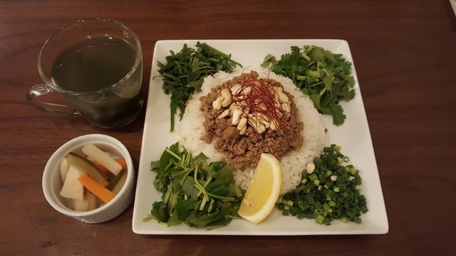 ここは迷わず「香草のそぼろカレー」(880円)を注文です。パクチー、大葉、三つ葉、万能ねぎ、ナッツが入ったそぼろカレーとピクルスとわかめスープがセットになっています。さらにご飯の大盛が無料で可能です。