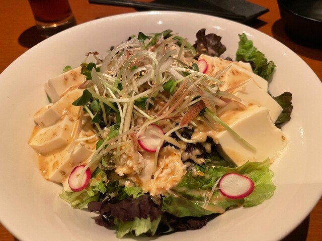 まずサラダと刺し盛りを注文。豆腐のサラダはボリュームがしっかりとしていて食べ応えありです。