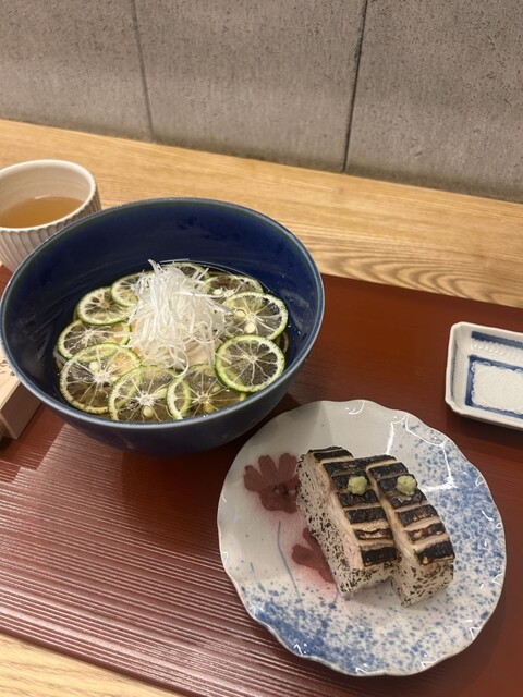 蒸し鶏とすだちの冷やかけそば1700円と、炙り〆鯖寿司600円に感動したランチでした。