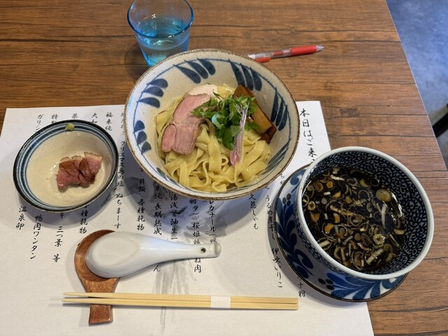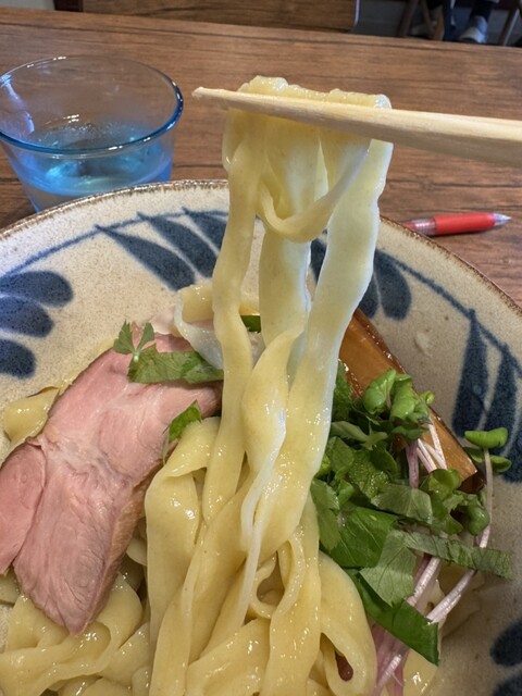 麺は平打ちタイプで表面にたっぷりとスープが絡む仕様に!この麺が、これまた秀逸で!加水高めなんだけど、小麦感はしっかりと強くて噛み締めるとそれ由来の甘味もしっかりと!噛み締めた食感がこれまた不思議で…ランチョンマット代わりに敷かれていた紙に記載されている「三層麺」がつけ麺にも適用されているのかな⁈表面は柔らかいのに、中の方にはしっかりとした食感の強さがあって…その強弱の差にラーメンでは珍しい食感を覚えるのですが、ネチャっとする訳でもなく…とにかく歯が喜ぶ噛み応えはオンリーワン‼︎