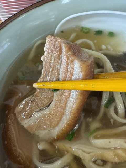 前述の前日に食べた沖縄そば同様にクリアなスープは節系を中心とした乾物魚介系出汁のスッキリタイプ…なんですが、こちらには動物系も入れている様でスープにしっかりとした厚みがあり、やたらと美味しい!ここに入る3種の豚肉が浸かる事で出る煮汁が染みて、食べ進める毎に徐々に優しい甘さが拡がるのも◎で!この計算も◎です‼︎
