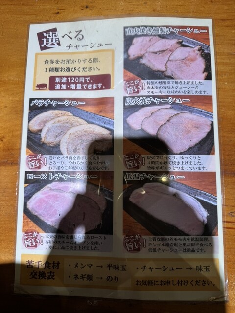 カウンター席に着いて店員さんに食券を渡すと、麺を大盛にするかチャーシューを2種類とするかのサービスがあると…麺が好みのタイプでなかったら…という懸念もあった為、チャーシュー2品でお願いする事に。その用意されていたチャーシューは全部で5種類。その中から「バラチャーシュー」と「低温チャーシュー」でお願いをしました。