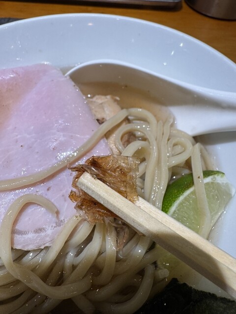 麺とつけ汁の他に別皿が置かれて、そこには山葵塩にトリュフ塩、鰹節キャラメリゼに柚子皮が盛られていましたが…これはお店に麺に自信があるからこそ故の配膳かと!実際にキュッと締められて少し硬い食感に仕上がっているストレート太麺は小麦の風味と甘味が強くて…非常に美味しい‼︎