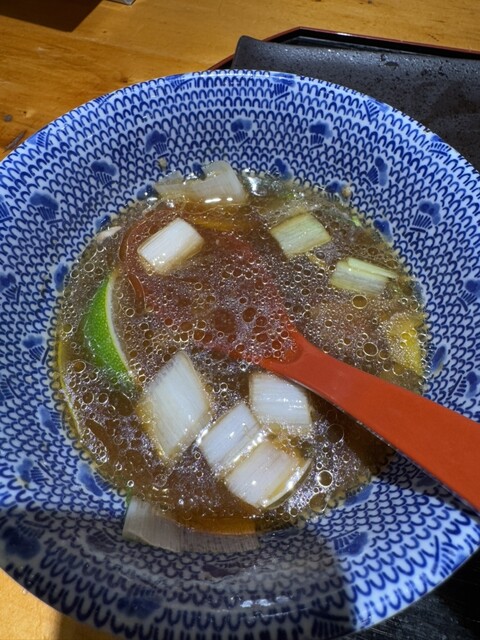 そこ迄食べ切ったら、余った昆布水をつけ汁の入る丼の中へと投入!昆布水って冷え切っている事が多いし、合わせたスープとの馴染みがあまり良くないと、昆布水割って美味しくなくなってしまう…このパターンが非常に多いんだけど、このメニューはスープと昆布水がよく馴染むせいか、そんな印象が全く無い!昆布水の出汁感の勝利か⁈