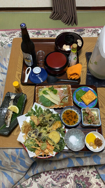 各種山菜天ぷらにニジマス焼きの夕飯、山の静けさを楽しみつ堪能しました。