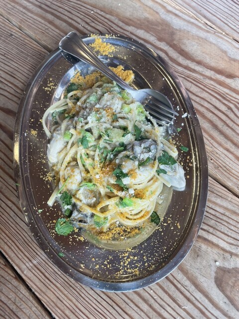 牡蠣、菜の花、カラスミのオイルソースリングイネ