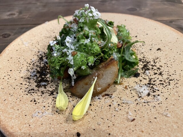 春菊ペースト、茴香、焼いた真鯛の出汁を合わせたソースに真鯛のオーブン焼きとカラスミ、自家製のドライトマトを添えた