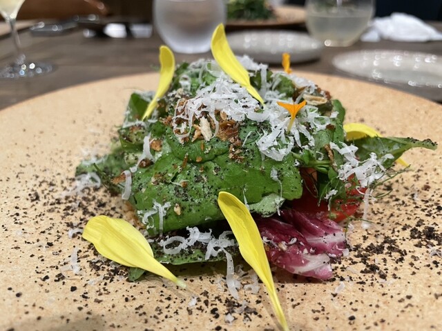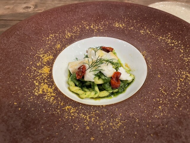 ほうれん草、リコッタチーズ、卵に少量の小麦粉を加えて作るニョッキのようなパスタ。 トップはトマトと海老のお出汁を泡状に、生海苔、セージ、桜海老、グリーンピースを加えて