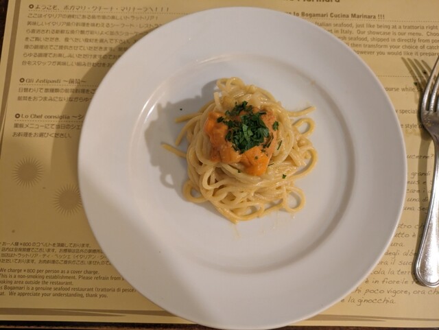 その後のウニクリームパスタも旨い。上のウニが普通サイズでうーん、絶妙かな。