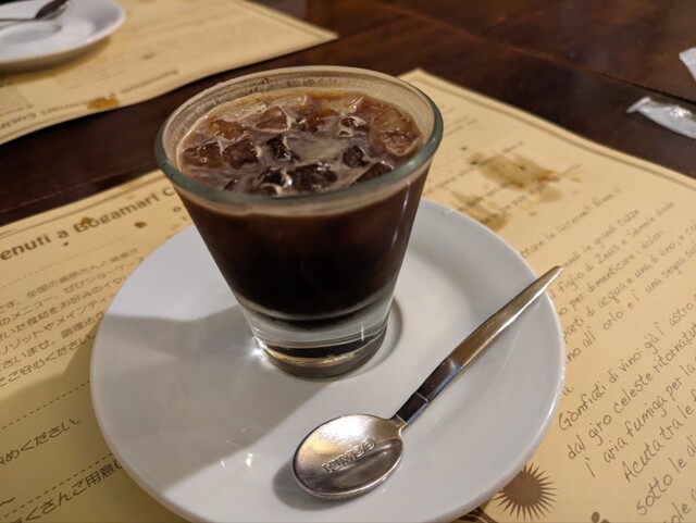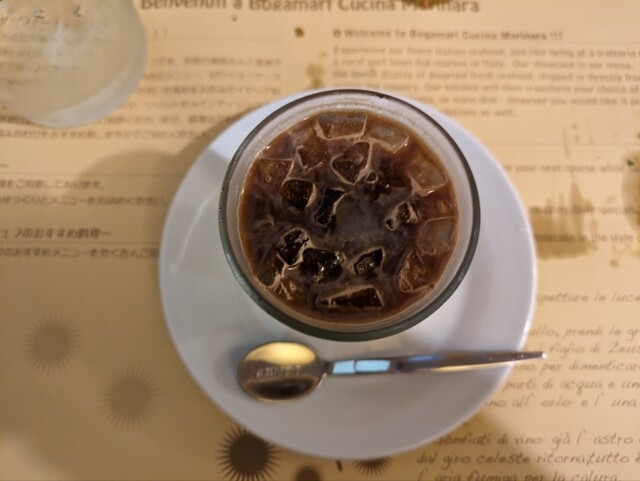 カルパッチョ5種類は全て味を変えていて、それもまたGOOD。最後の金目鯛と貝のトマトソース、そりゃ貝が色々入ってて不味いわけ無い‥。パンが進む。 最後はエスプレッソアイスで。