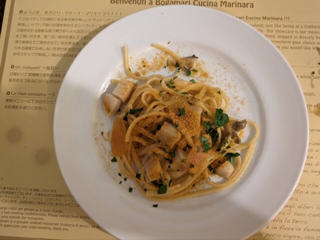ウチワエビ、ふるさと納税でも食べたことないので、こちらをグリル、平貝が目に入り、カラスミが食べたいと言う連れの希望で合わせてパスタ。そして、連れがウニが食べたいとのことでウニのクリームパスタ。で、最終的には足りなくてカルパッチョを。メインの魚は、お勧めに負けた?で、金目鯛をトマトソースで貝と共に。