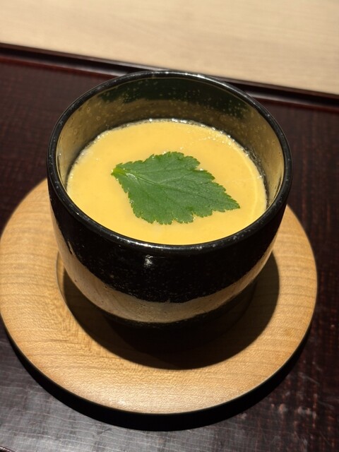 大分県のブランド卵「蘭玉」を使用した茶碗蒸し。鮮やかな黄色はパプリカを飼料にした卵ならではで、舌触りはとても滑らか。ホタテや銀杏の香りが、クリーミーな卵の味わいと見事に調和しています✨