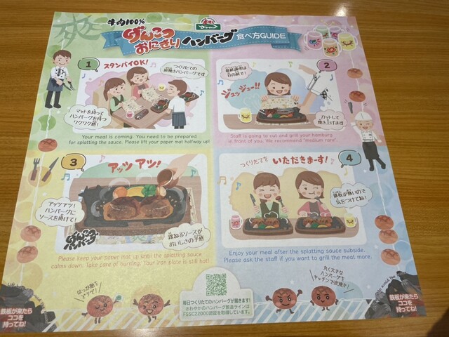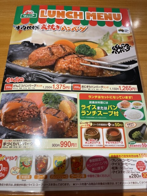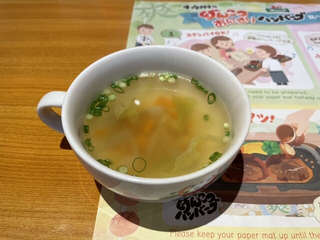 げんこつハンバーグランチと竜田揚げをオーダー。ツレはおにぎりハンバーグとオニオングラタンスープ。