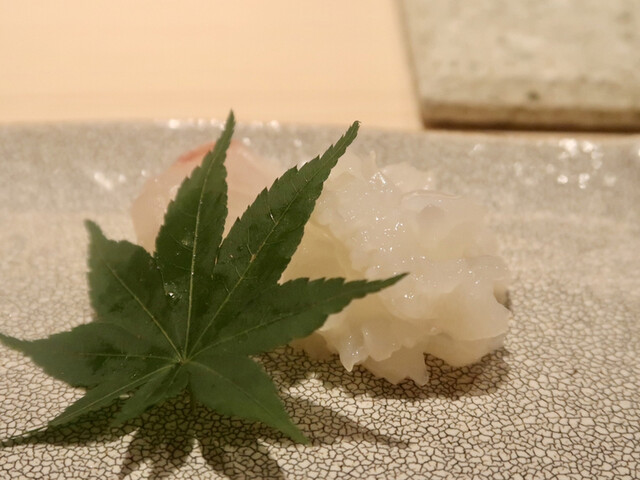 握りは、「春子鯛」から始まる。皮目を軽く炙り、昆布締めも軽めに仕上げた口溶け軽やか。圧巻は、「シロイカ」。極薄に切りつけミルフィーユ状にすることで、シロイカのポテンシャルを底上げ。サクッとした食感を残しつつ、とろける握りに仕上がっている。また、「煮蛤」は63度で低温調理。試行錯誤の上、たどり着いたのがこの温度だそう。そして、ツメを使わず、蛤の煮汁を煮詰めたものをさっと塗る。噛みしめるごとに、蛤の旨みがあふれる構造だ。白甘鯛は、昆布締めの前に、日本酒の磯自慢で塩抜き。「イサキ」は、信頼を置く仲買のおすすめだそうで、淡白な白身のなかにも旨みある脂を感じる。「マグロ」は、塩釜産の赤身と中トロ。旨みと鉄分を強く感じる握りだ。
