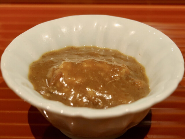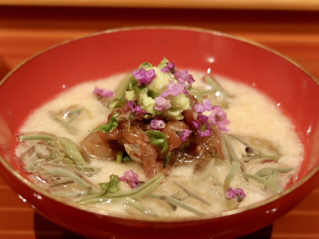 島根県の西部沖で4月〜9月の期間に平均脂質10%以上・サイズ50g以上という厳しい規格を満たした“どんちっちアジ”を使用した「なめろう」。旨みが詰まった肉質。潤菜ととろろで、芳醇でなめらかにいただく。
