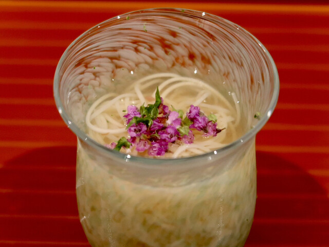先付けには、蒸し暑い季節にぴったりな冷たい「梅そうめん」。長崎県五島列島産そうめんに、底のオクラ、トマトと一緒に。梅と塩のみで調理しており、さっぱりとヘルシーにいただける。