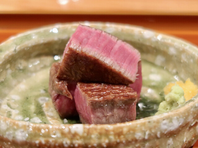 「青海苔の茶碗蒸し」は、有明産青海苔に白ウニをトッピングしたもの。磯の香りと味が口いっぱいに広がる。金目鯛のマッチョな肉をレアにプリプリに仕上げた「金目鯛のタタキ」は、思わず頬が緩む美味しさ。