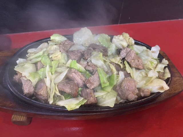 少し待つと焼きたての鉄板と登場し、ケムリモクモクとたまらない匂い!