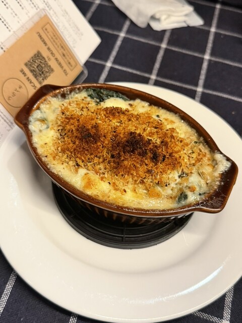 デキャンタとグラス白ワイン飲みつつ、カンパリいちじくのバター、ポテサラ、おすすめ黒板にあった鱈の白子グラタンをオーダー。