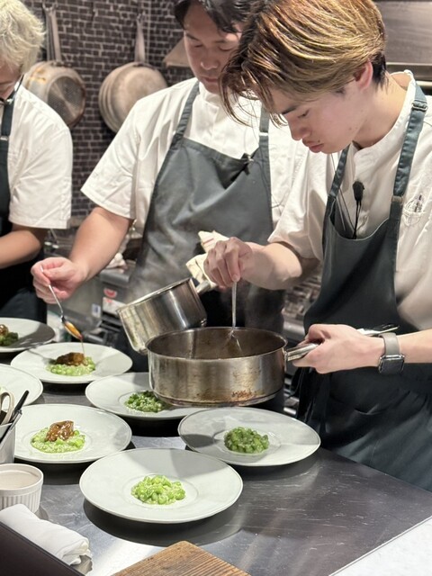 スープペアリングという新しい手法。素材の良さとそれを引き出す調理方法、素材の組み合わせが味わいを別の次元に引き上げています。どの料理もプレゼンテーションも素晴らしく、カウンターの向こうのオープンキッチンがまるで劇場の様。