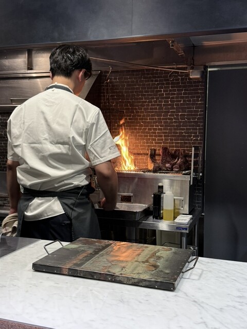 コースだと料理が目の前に運ばれてくる前にネタバレ感がありますが、アラカルトメニュー中心の現在のスタイルだと、今の方が良いのでしょう。にしても滅多に無いとは思いますが、二階のダイニングや半個室の席の分も含めて、一気に皿が並び仕上げていく様子は圧巻です。
