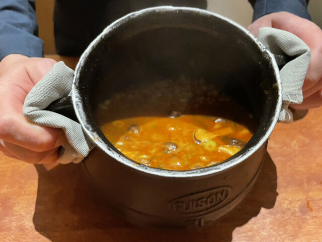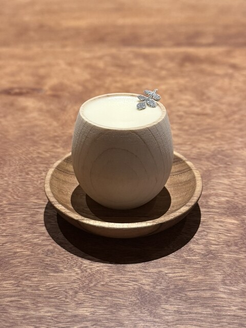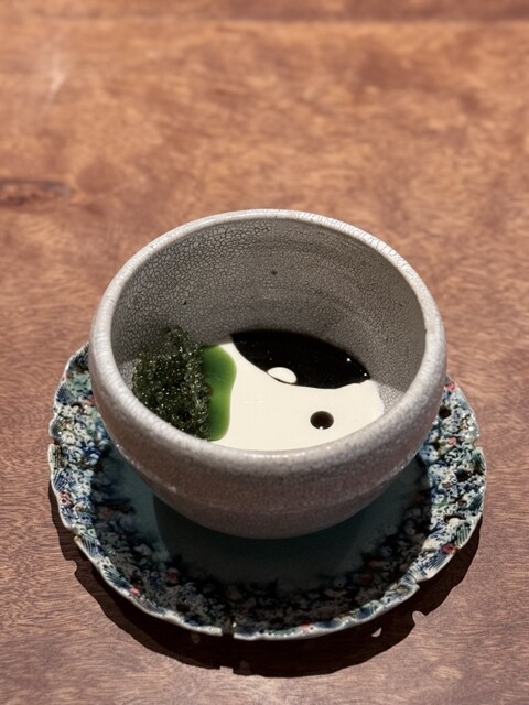 コースの流れは大きくは変わりませんが、まずは最初の水から。今までは熱々のスープを出されていましたが、今回は冷たいもの。アグー豚から取ったもので冷やしていてもしっかりと旨みを感じる。