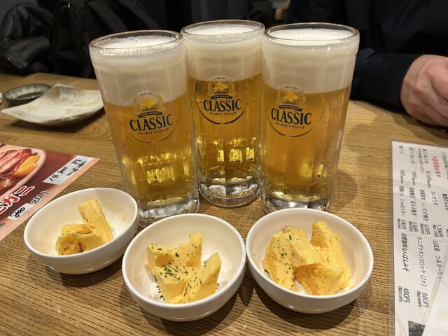 まずは生ビールで乾杯です。お通しは甘めの玉子焼きでした。
