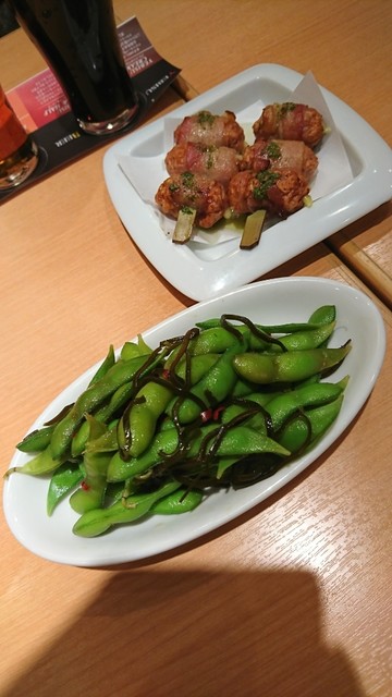 おつまみは「日高産塩昆布枝豆」と「チーズポーク串焼きジェノベーゼソース」