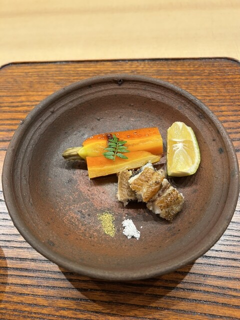 白アスパラは、焼かれていて余計な水分が抜けサクサク。しっかりとした食感のアオリイカ。優しく香ばしい一寸豆。それらをなめらかな黄身酢が包み込む。上に山椒があしらわれ心地よい夏の香り。