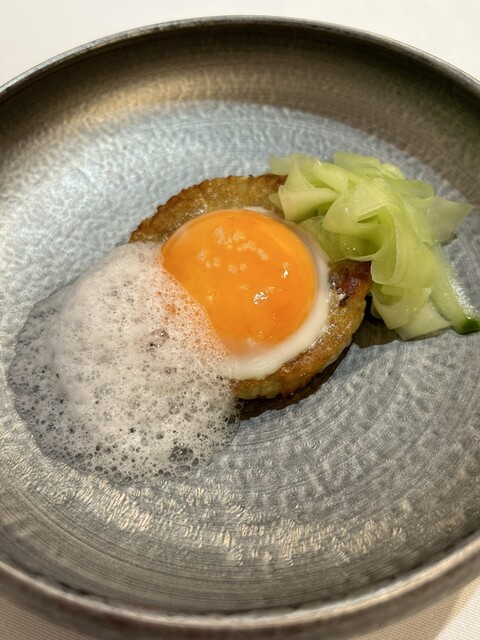 海鞘の焼きリゾット 卵黄 優しい皿が続いた後にドカンと濃厚な皿。すごく面白い。