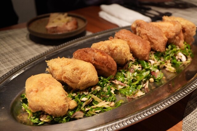 料理はキャビアのカナッペから。薄力粉のブリニーにクリームチーズとキャビアを乗せる。それぞれの持つ塩気が乾杯のシャンパンにぴったり。幸先のよいスタートでございます。続くのは鱈の白子のフリット。しっかり火入れした衣と柔らかい白子のコントラストが見事。味がしつこくならないように、生のマッシュルームや香草のサラダでアクセントを作ります。