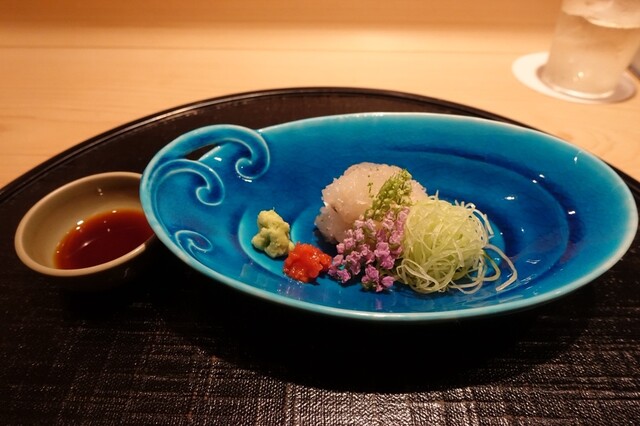 冬の名残には河豚。醤油も適度で、焼いたことによる風味がふくよかな「焼き河豚」、クリーミーで同じくふくよかな「焼き白子」と続きます。前者ではアラと身の食べ比べさせてくれますが、骨の周りの部分に旨味が集まっているよう。気持ちを察してか、手掴みで食べちゃってください!というお言葉。それでは遠慮なく!笑