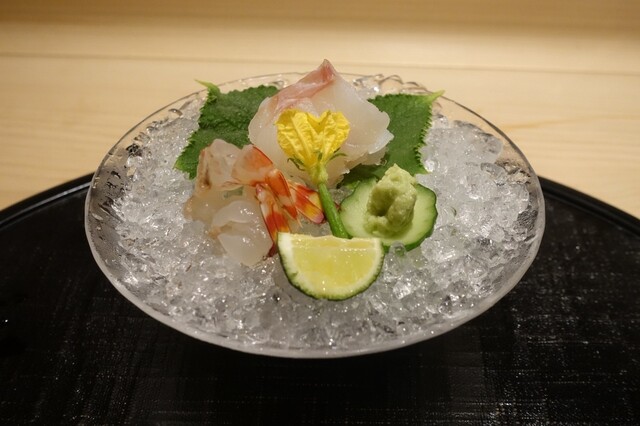 「ぐじ」や「玉蜀黍」の天麩羅は軽やかに仕上げ、油の存在を感じさせない。清らかな「キジハタ」と「車海老」の洗いが流れるように続き、「鰻と冬瓜」では、香りを主体に仕上げた出汁に、強い塩で引き締めた鰻の旨味がじわじわと溶け出す。その重なりによって初めて料理が完成するのだ。