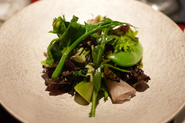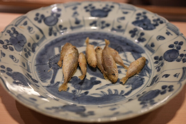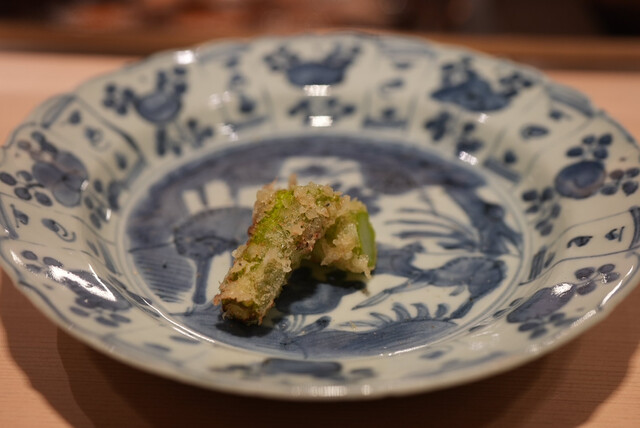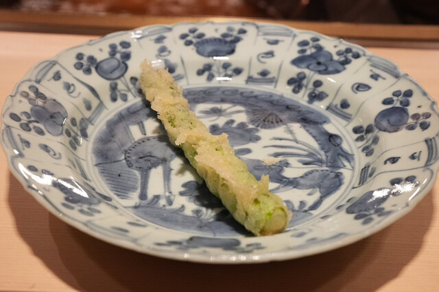 天婦羅が始まる前のプレゼンテーション。まずは「新玉葱のすり流し」をクエの出汁で伸ばしたもの。これは静岡の素材の素晴らしさを伝える。そして、低温で火入れした「クエ」。皮の旨味が驚くほどだが、これこそ油料理が実現する味わい。50度ほどの温度ながら一度皮をゼラチン化させることで一体感を作り上げます。素材の素晴らしさ、油料理のキャパシティの広さを目の当たりに。続く、ミルガイや鰆においても食感と味わいは唯一無二もの。成生の更なる進化を確信するスターターでございました。