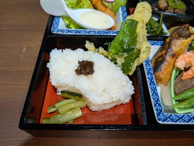 左上はきよら海老の海老フライが2尾、右上にはマグロの煮付け木の芽添え、右下にはカレー春巻き、大根とこんにゃくとインゲンの煮物きよら海老添え、左下には扇に型どられたご飯、野沢菜漬け、大葉の天婦羅が配置。