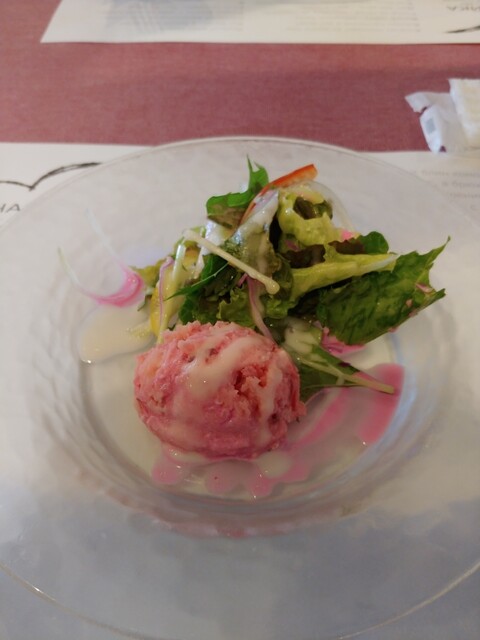 サラダは、ポテトサラダなのですが、ビーツが多分入っているのでピンクです。