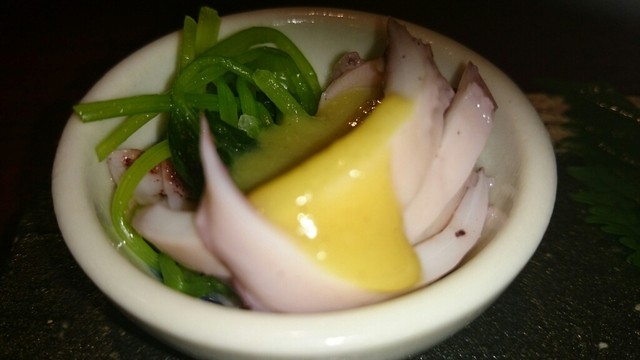 お通し、茗荷とおかか逢え、つぶ貝、イカの酢味噌あえ