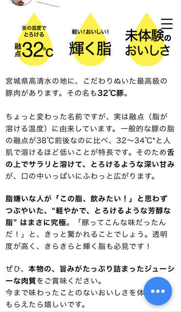 宮城県の高清水というところで作られてる豚でして品名が32℃豚と変わってますがこの豚の融点が32℃