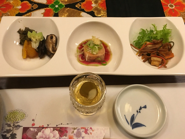 甘味の聞いた梅酒で喉を潤して、前菜は、餅巾着に