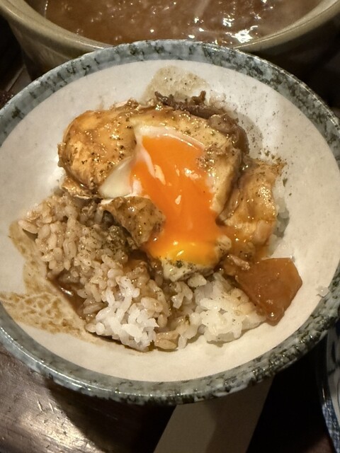 続いてボタン鍋に移ったのですが、今回は映えよりも味重視で、予め少し煮込んでおいてもらったのですが、飲みながらゆっくりいただく猪肉は最高です。通常、牡丹鍋の最後は雑炊にするのですが、こちらでは鍋に落とした半熟卵とお汁をご飯の上にかけていただくのがおすすめとのことでした。初めから最後まで満足感の高い食事になりました。